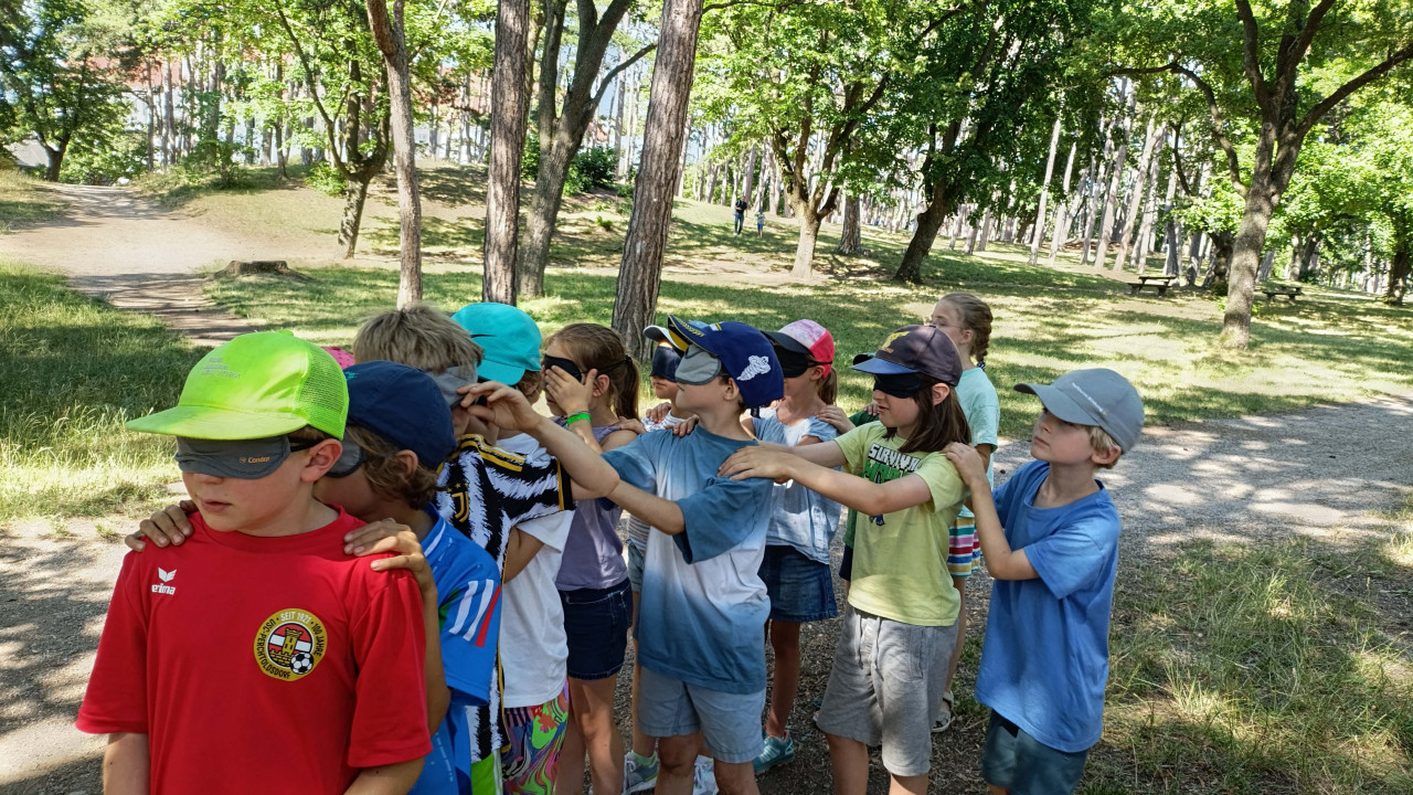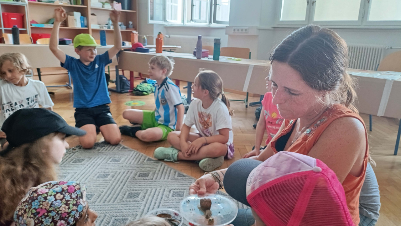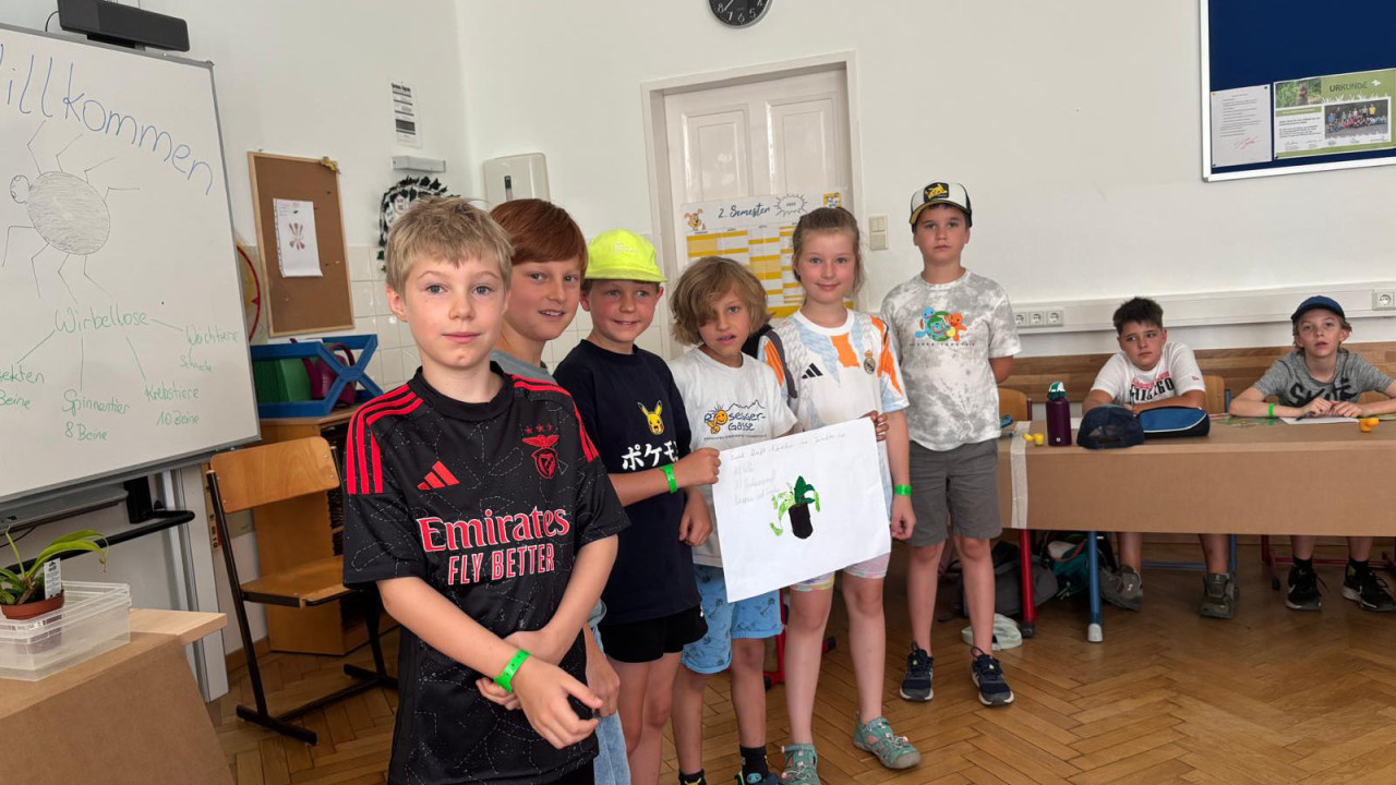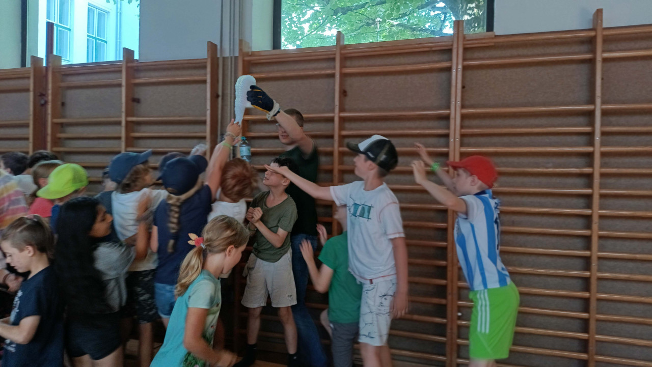 Unser heutiger Tag begann nicht wie gewohnt mit einem gemeinsamen Warm-up, sondern startete frühmorgens direkt mit unserem Ausflug zur Liesing. Dort machten wir uns gemeinsam ans Forschen: Beim Keschern entdeckten wir verschiedene Flusstiere und betrachteten sie ganz genau. Nachdem wir uns im kühlen Wasser ein wenig abgekühlt hatten, ging es auch schon zurück, wo wir das leckere Mittagessen genossen.